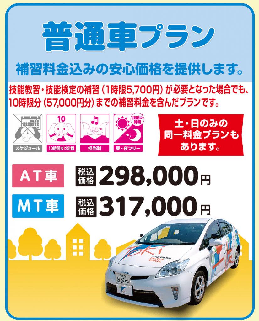 | ●入学金 ●写真代 ●適性検査代 ●教材費 ●技能教習料(規定時限数分) ●効果測定料 ●仮免検定料(1回分) ●卒業検定料(1回分) ●10時限分の技能補習料金 ●消費税 |