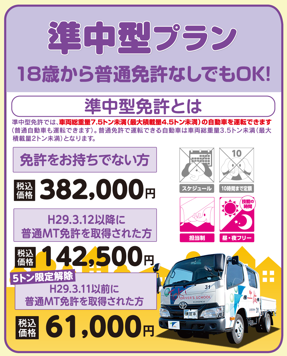 | 準中型車 ●入学金 ●写真代 ●適性検査代 ●教材費 ●技能教習料(規定時限数分) ●仮免検定料(1回分) ●卒業検定料(1回分) ●消費税 準中型5トン限定解除 |