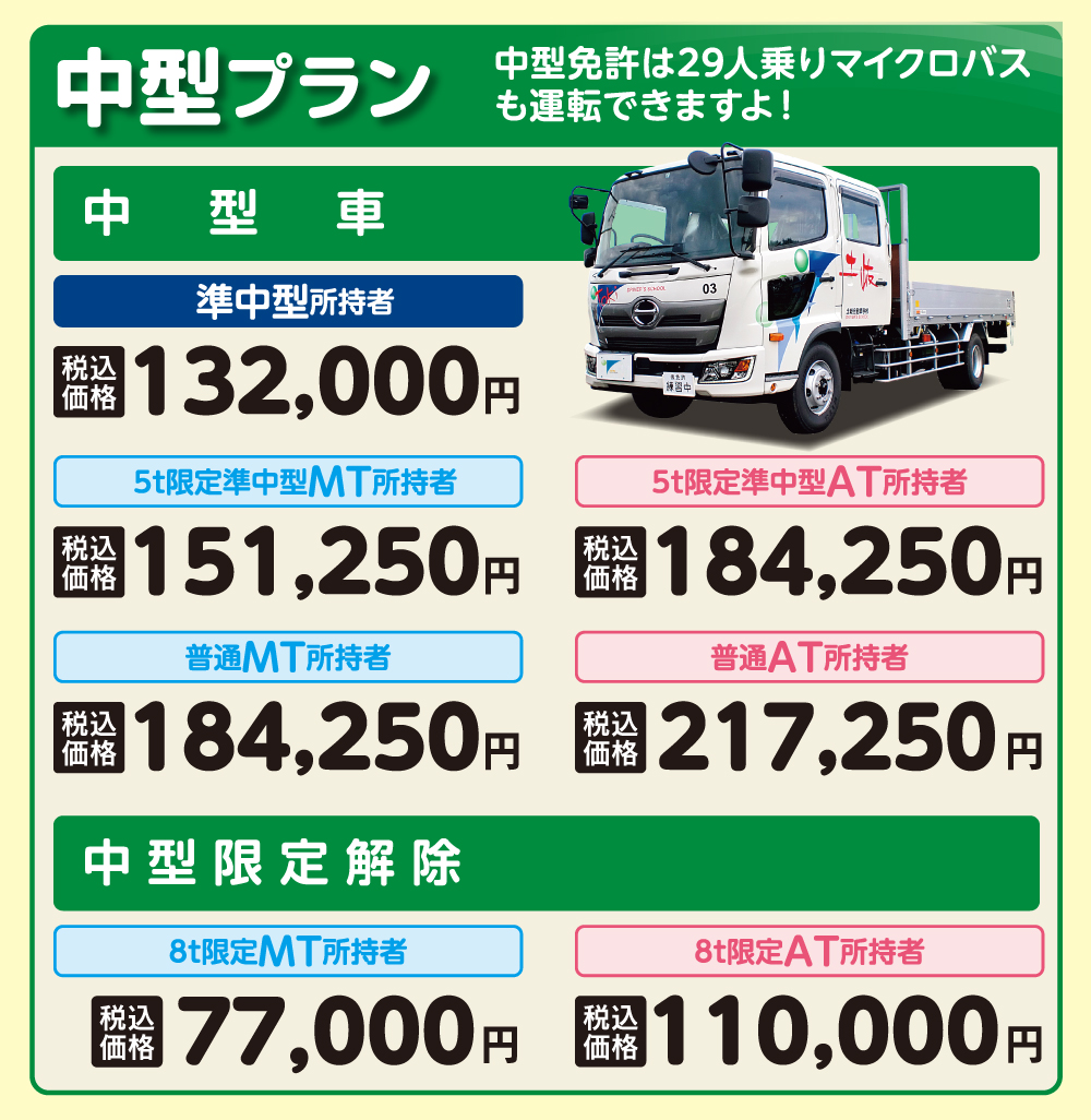 | 中型車 ●自由教習(任意)1時限 8,250円 ●技能の当日キャンセルはキャンセル料(2,000円) ●運転免許手数料(仮免許学科試験・仮免許証交付) 中型限定解除 |