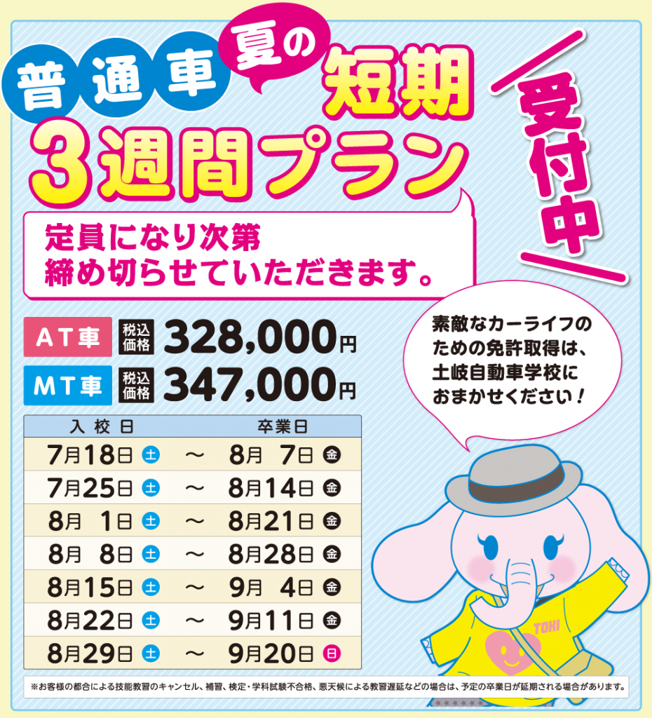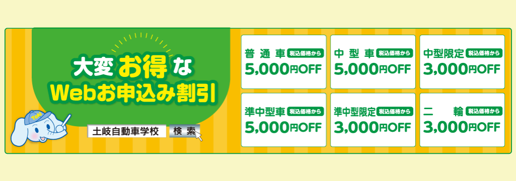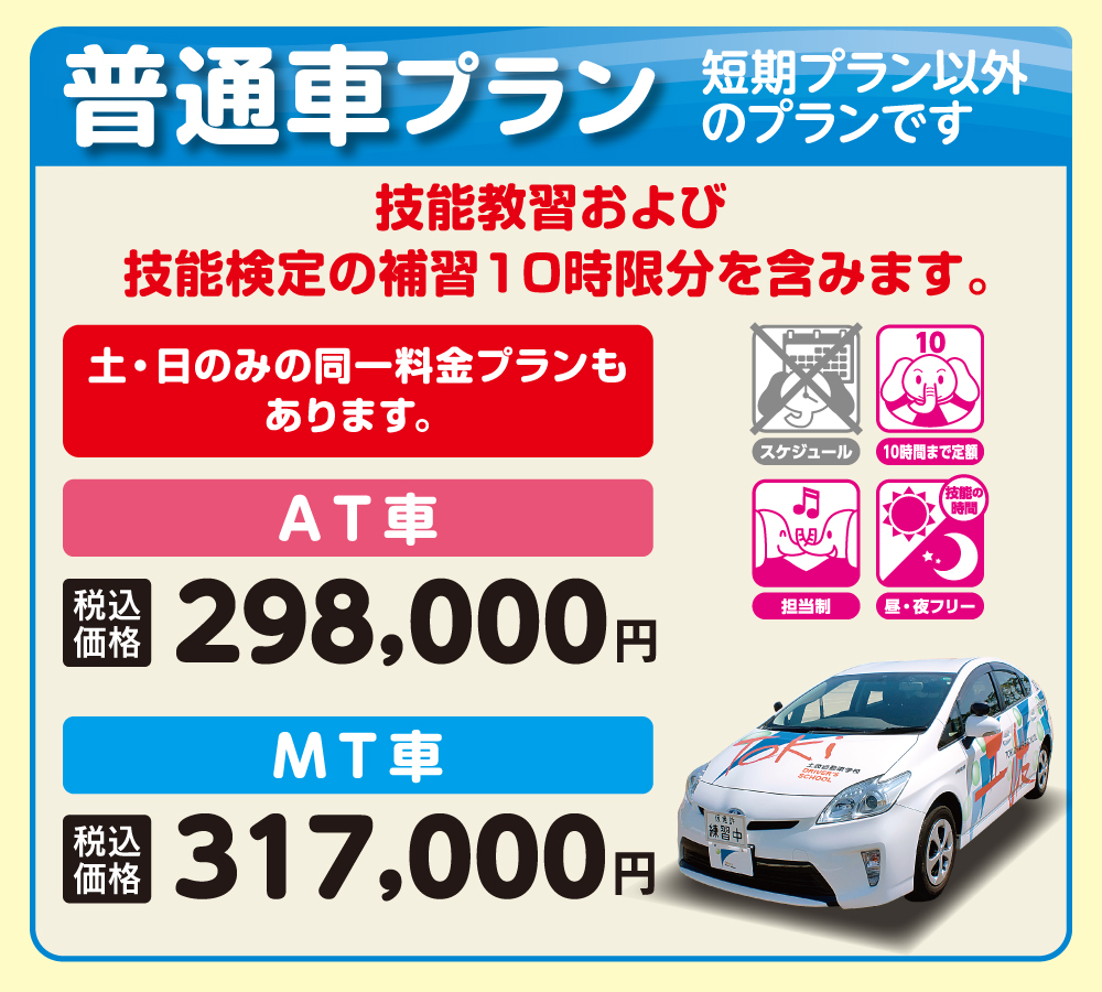 | 普通車のお客さまは別途手数料として、仮免学科手数料1,800円/1回、仮免交付手数料1,100円、県学科試験手数料(県内在住の方)1,900円が必要となります。 (別途手数料は非課税の料金です。入校時にお支払いください。) ※お客さまの都合によるキャンセル、補習、検定及び学科試験不合格、悪天候などによる教習の遅延などの場合は卒業予定日に卒業出来ない場合があります。 |