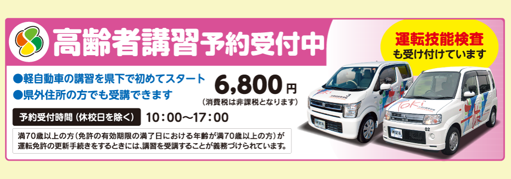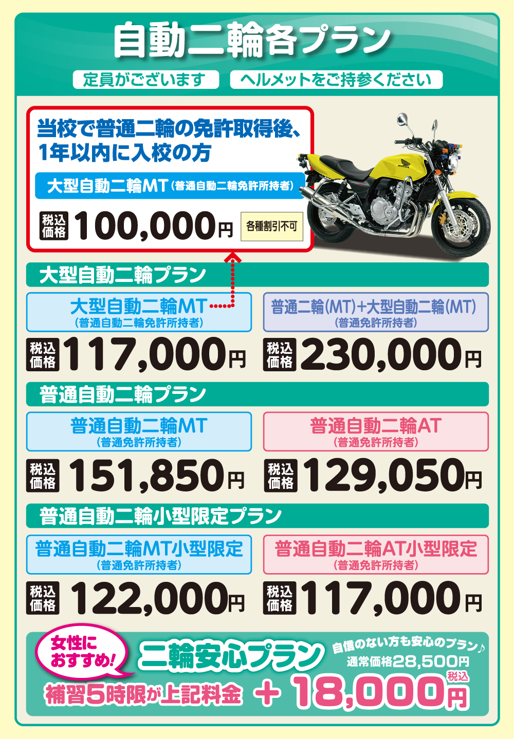 | ●自由教習(任意)1時限 5,700円 ●卒業検定料 ●技能の当日キャンセルは、キャンセル料(2,000円) |