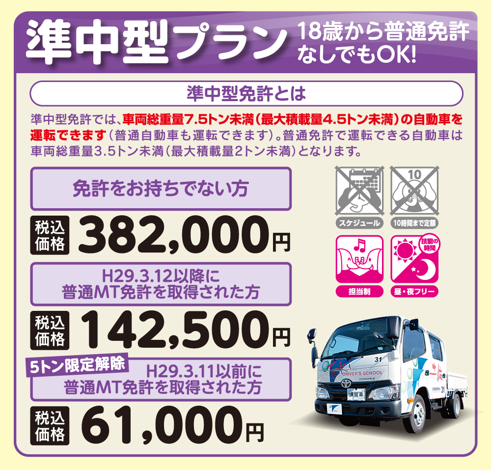 | 準中型車 ●入学金 ●写真代 ●適性検査代 ●教材費 ●技能教習料(規定時限数分) ●仮免検定料(1回分) ●卒業検定料(1回分) ●消費税 準中型5トン限定解除 |